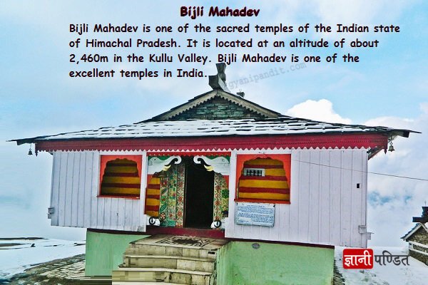 बिजली महादेव मंदिर “काश” स्टाइल में बना मंदिर है जिसमे शिव-लिंग भीं है। यह मंदिर कुल्लू से 14 किलोमीटर दूर हरी झाड़ियो से घिरे हुए जंगल के बीच में है। इस जगह का नाम अचानक हुए एक महान चमत्कार के बाद ही रखा गया था।